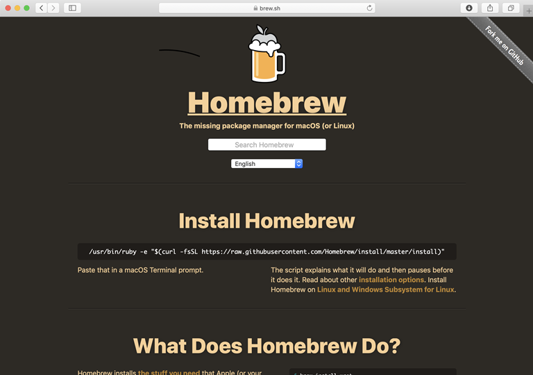 홈브루(Homebrew)는 자유-오픈 소스 소프트웨어 패키지 관리 시스템의 하나로서 애플의 macOS 운영 체제의 소프트웨어 설치를 단순하게 만들어준다. 원래 맥스 호웰(Max Howell)이 개발한 이 패키지 관리자는 루비 온 웨일즈 공동체에서 인기를 얻었으며 확장성으로 호평을 받았다. 홈브루는 쉬운 사용성, 명령 줄로의 통합이 가능하므로 이용이 권장된다.